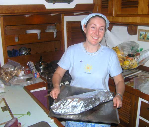 Queen of the galley, Sloan, with fresh caught fish in foil about to roast.